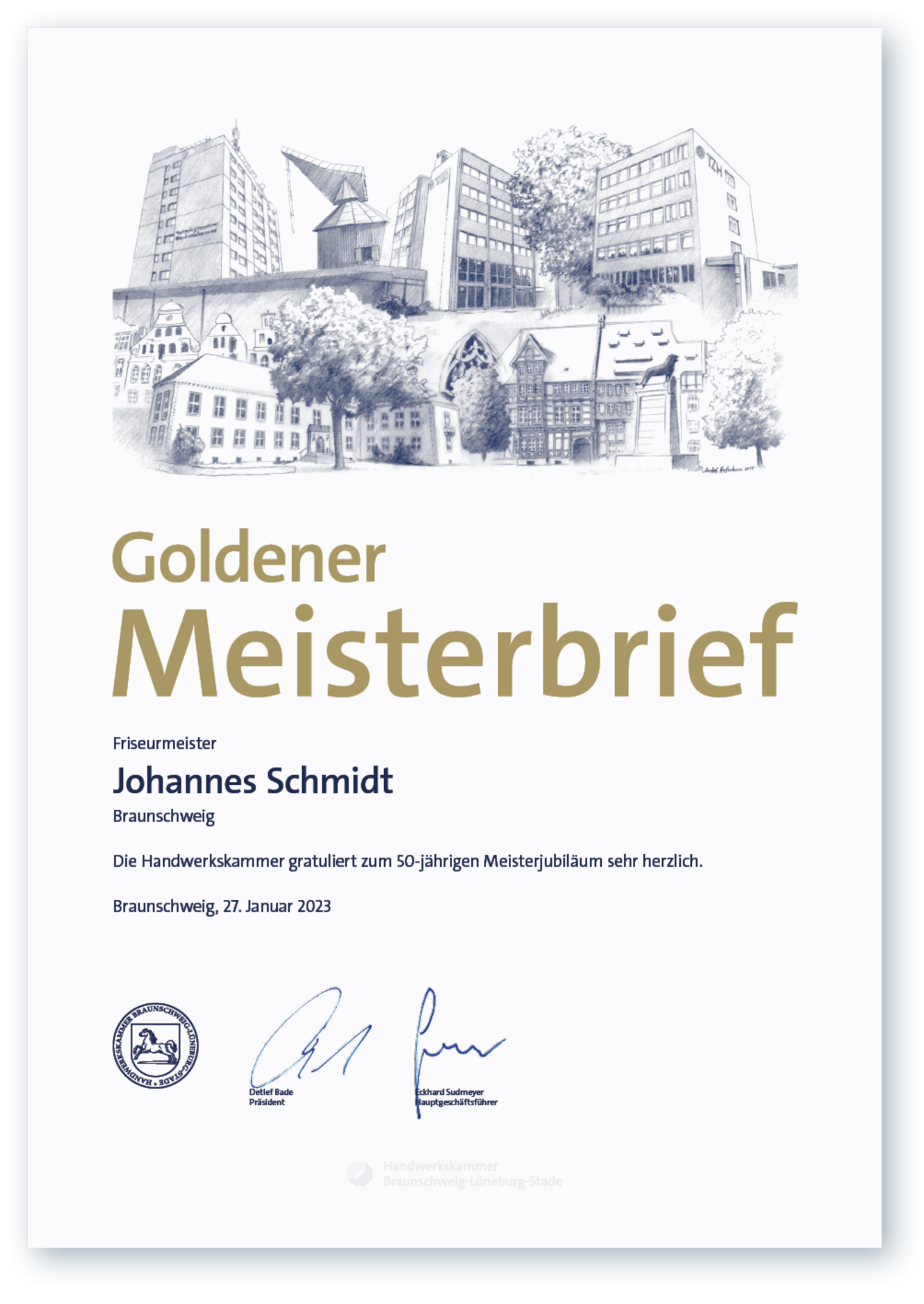 Zum 25-, 50-, 75-jährigem oder längerem Geschäftsjubiläum/Selbstständigkeit erstellt die Kammer eine Ehrenurkunde auf Antrag durch Innung, Kreishandwerkerschaft, Betriebsinhaber oder andere Person.